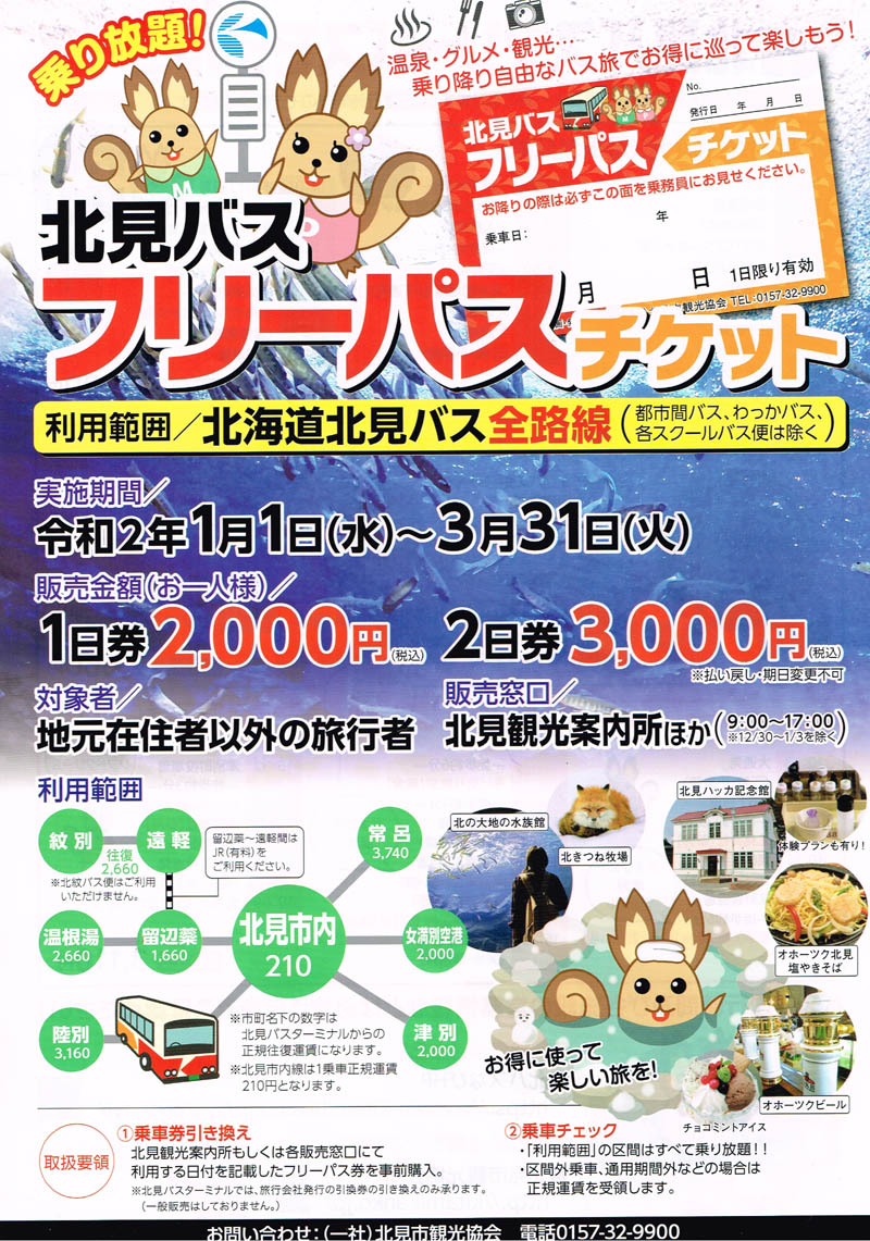 | 北見へ行こう!@ 北見バスフリーパスチケット(北見バス運行路線外市町村の方が利用できます。) |